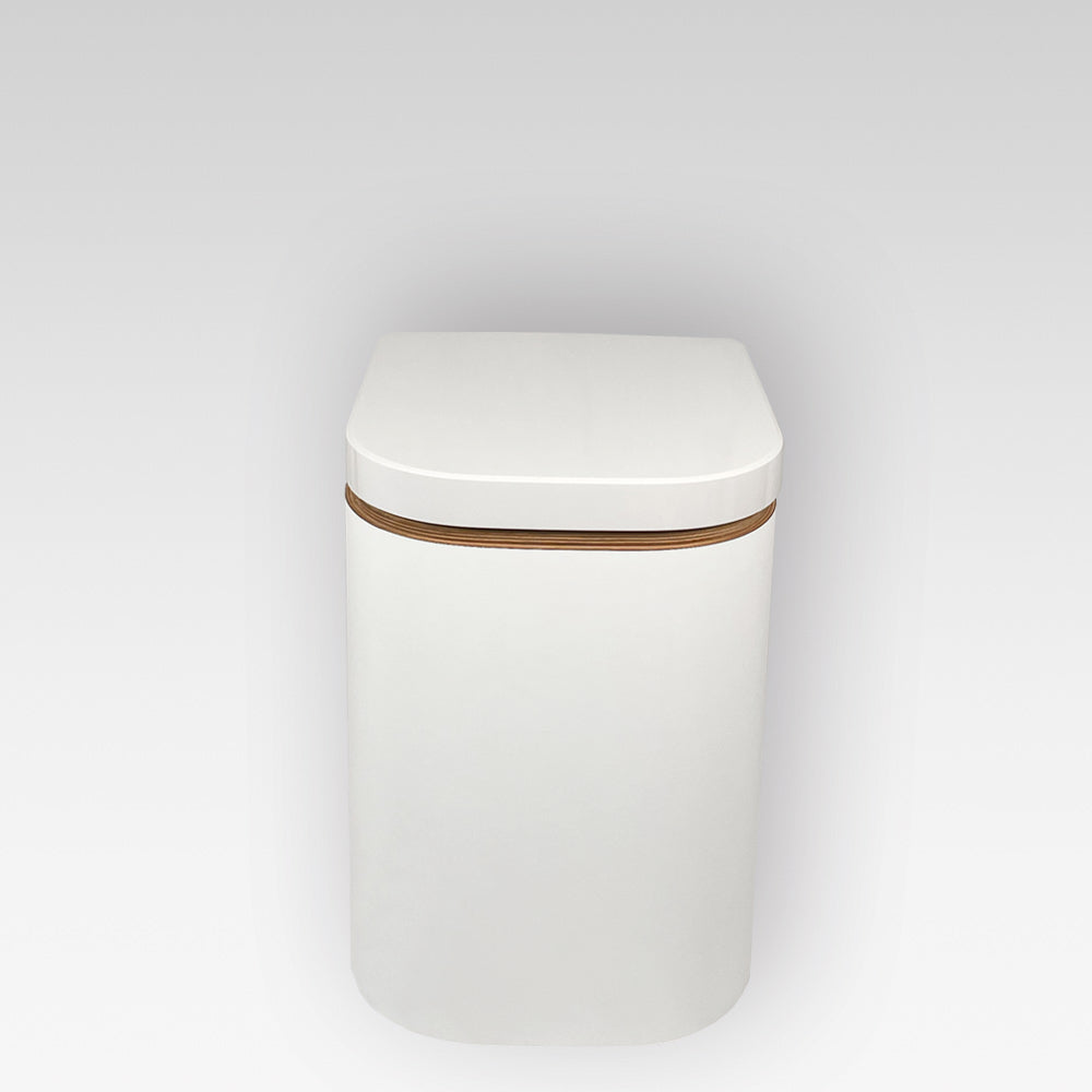 Moderner weißer Komposttoilette mit Holzdekor am Deckelrand, schlankes Design.