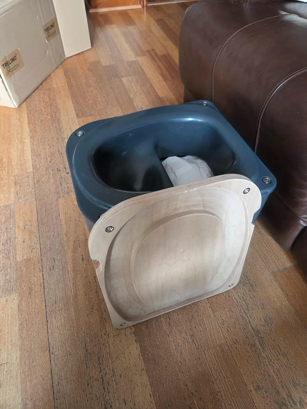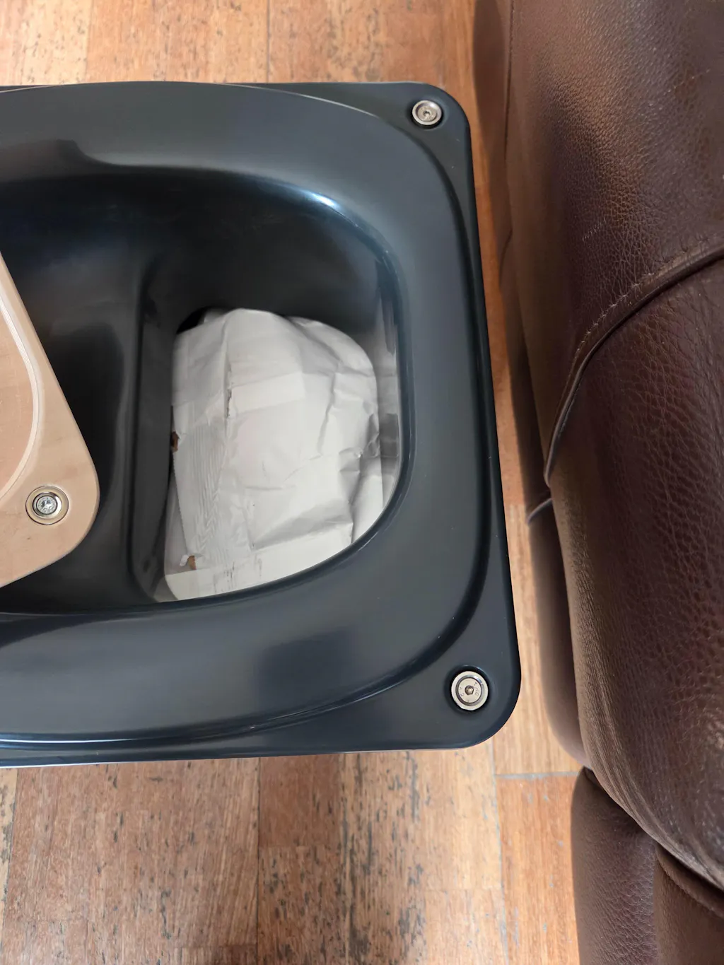 The separation insert directs urine into a canister, while solid waste is collected in a separate container. For easier disposal, this container needs to be equipped with a trash bag. More about the function of a composting toilet
